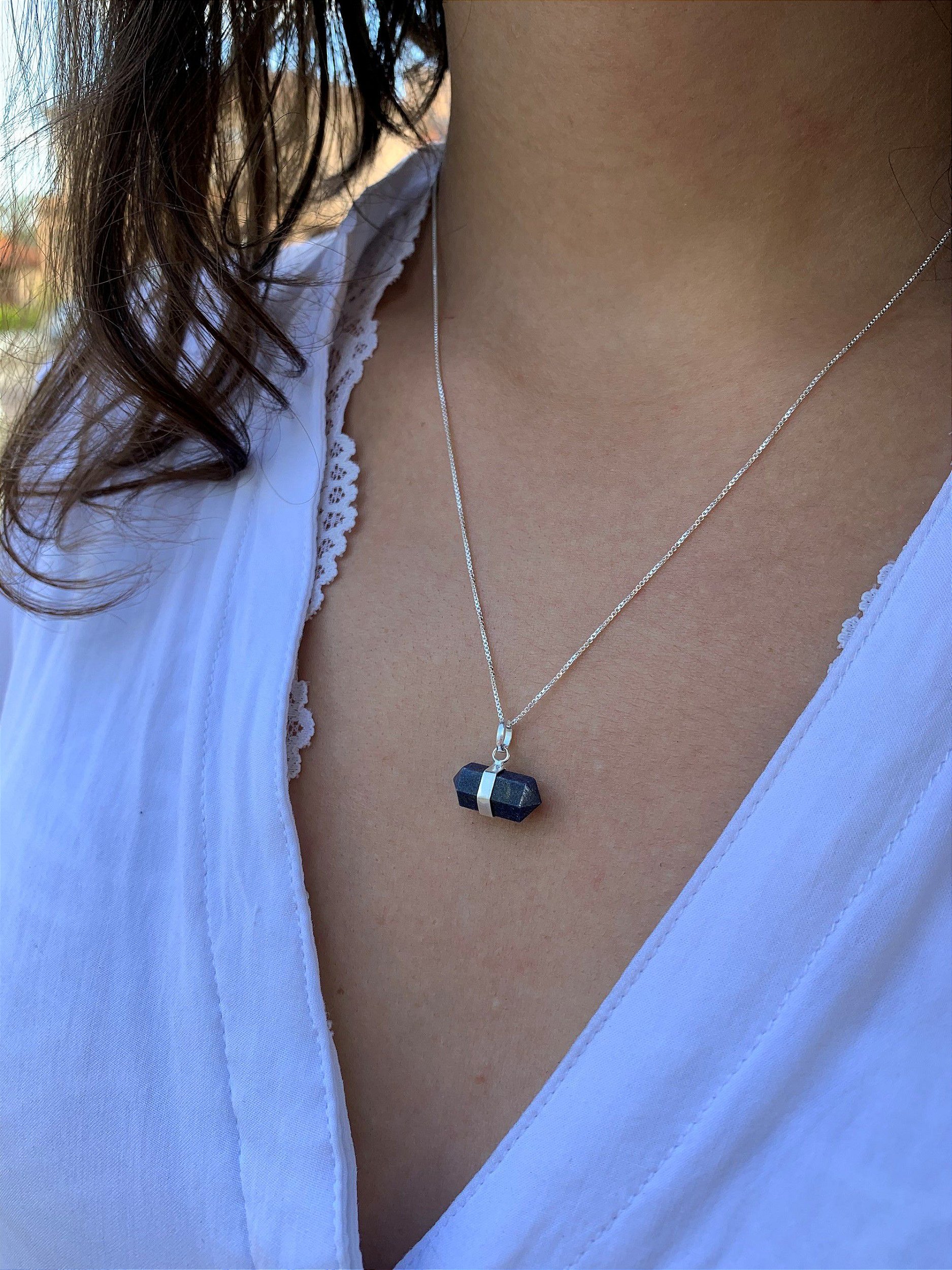 Pingente Sodalita biponta horizontal pequeno em Prata 950.